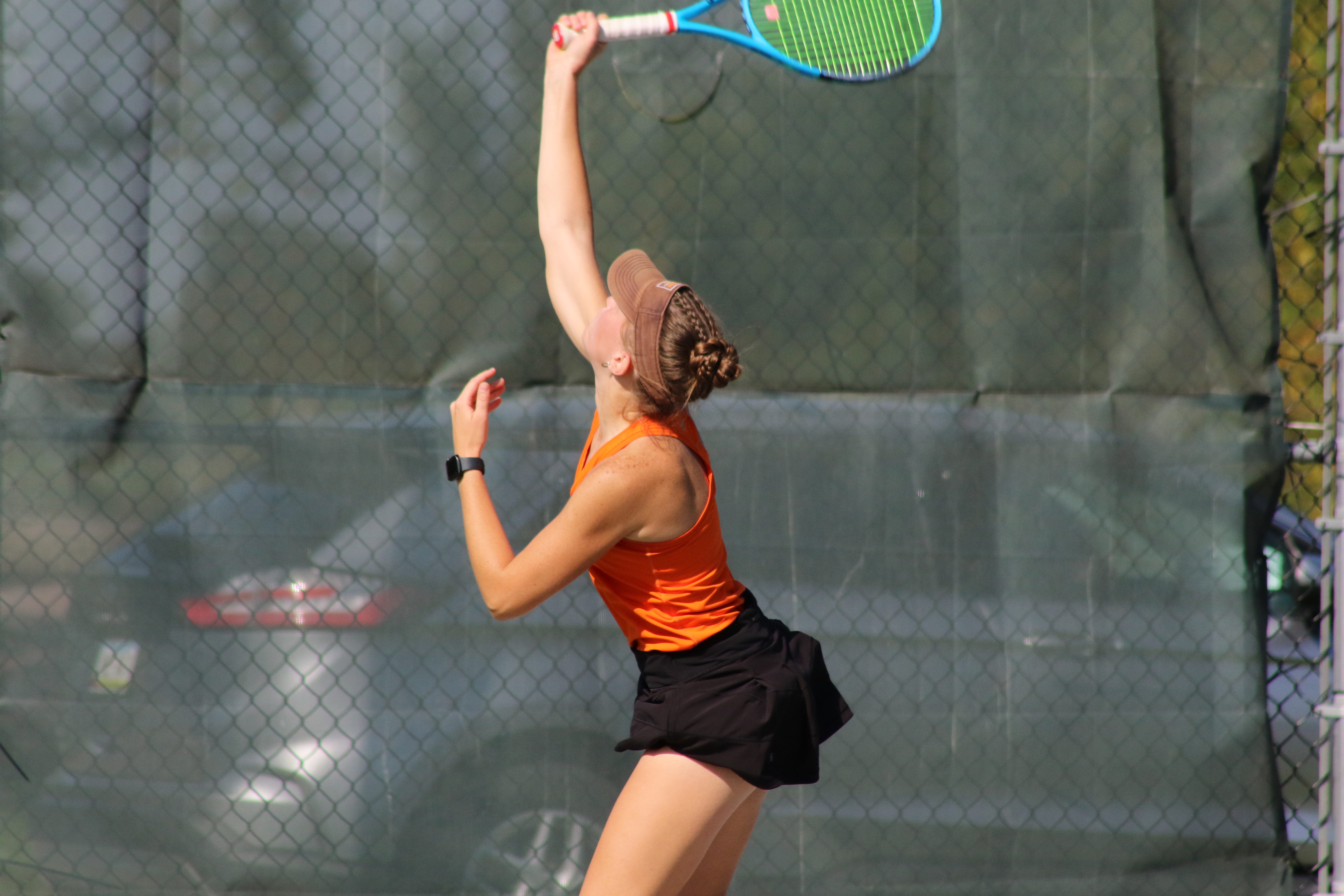 Senior Tori Johnson goes up for the serve at a meet on Sept. 27th at the Meirink Family Tennis facility. Photo courtesy of Madi Petersen.